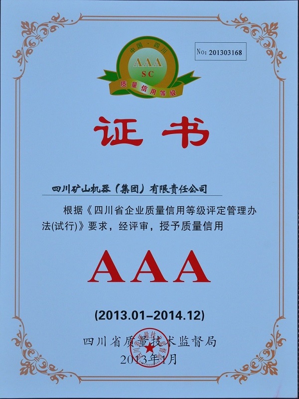 Sichuan Coal Group Inc. has, learned from the provincial food safety regulator, Sichuan Mining Machinery (Group) Co., Ltd. was awarded the "Sichuan Province corporate credit rating of AAA quality enterprise", and presented a certificate of honor.