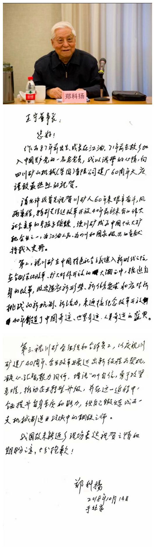 原中組部副秘書長、中央政策研究室副主任鄭科揚專門為川礦集團六十周年華誕發(fā)來的賀信